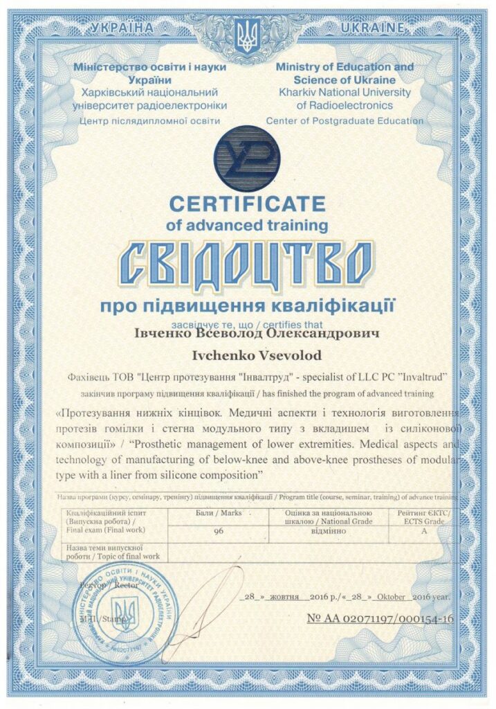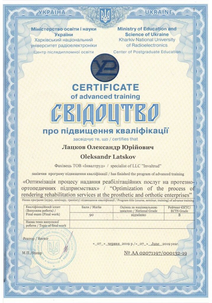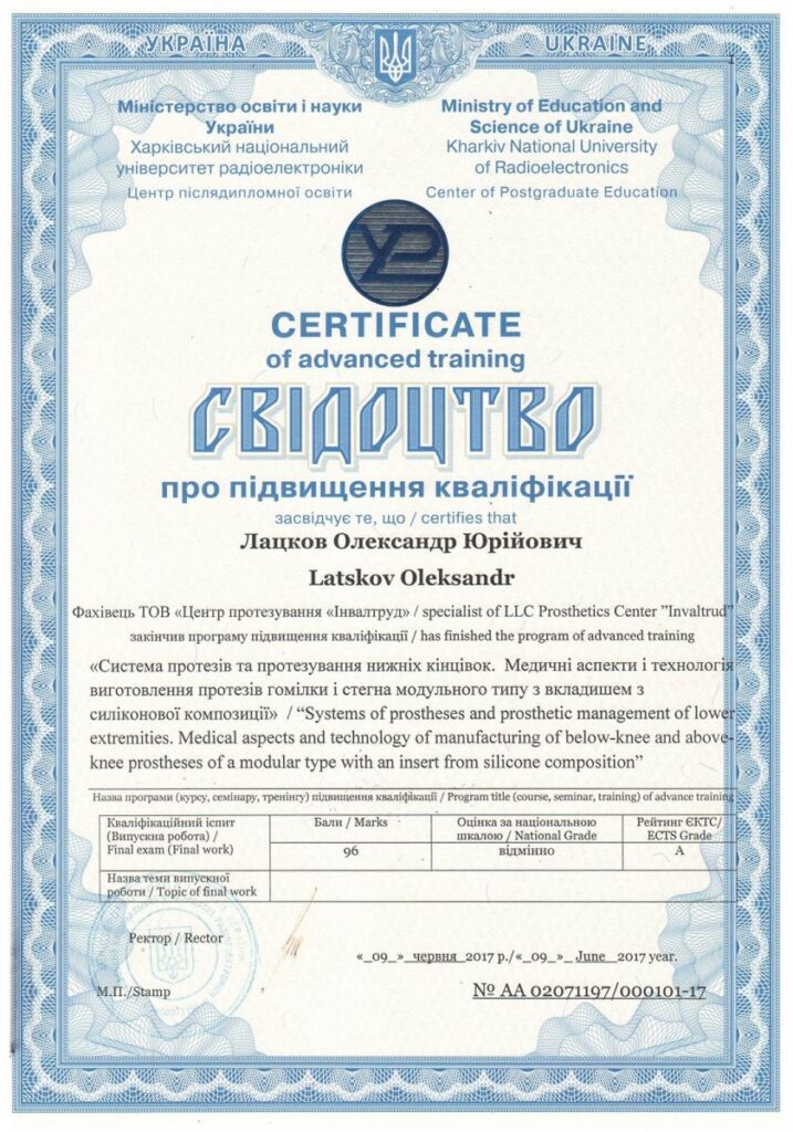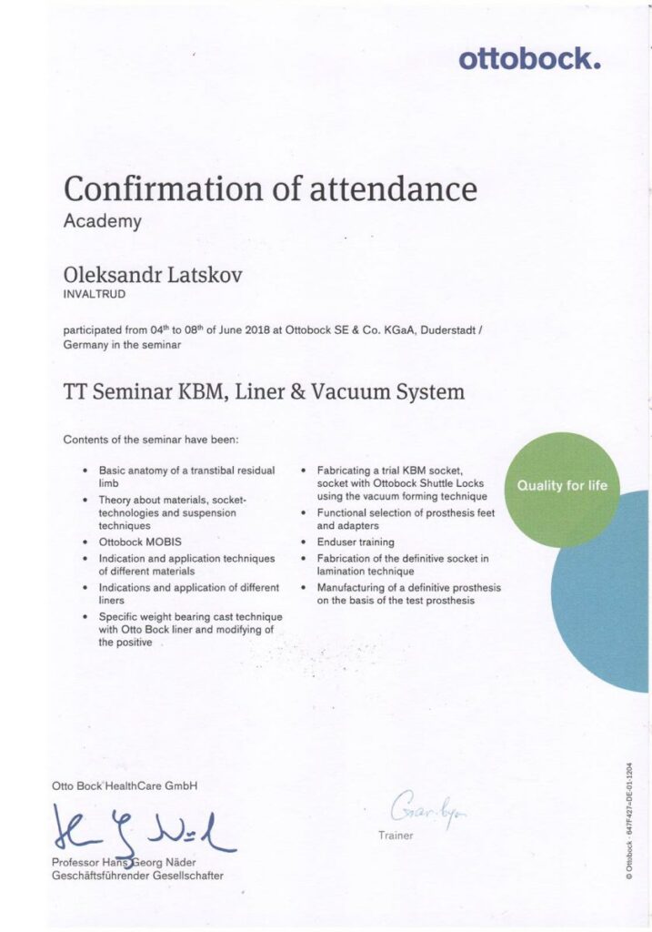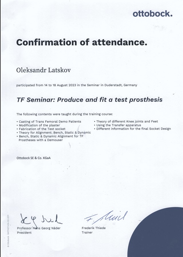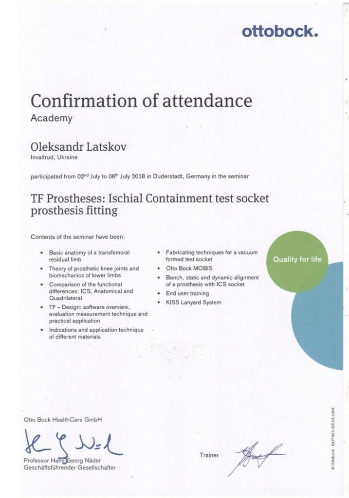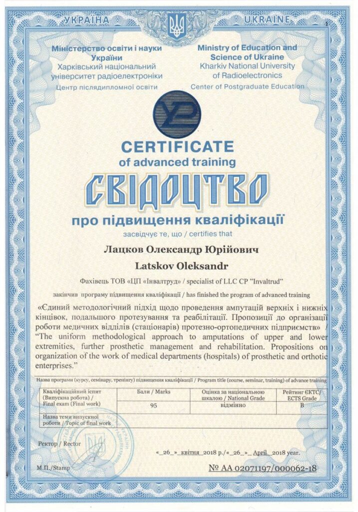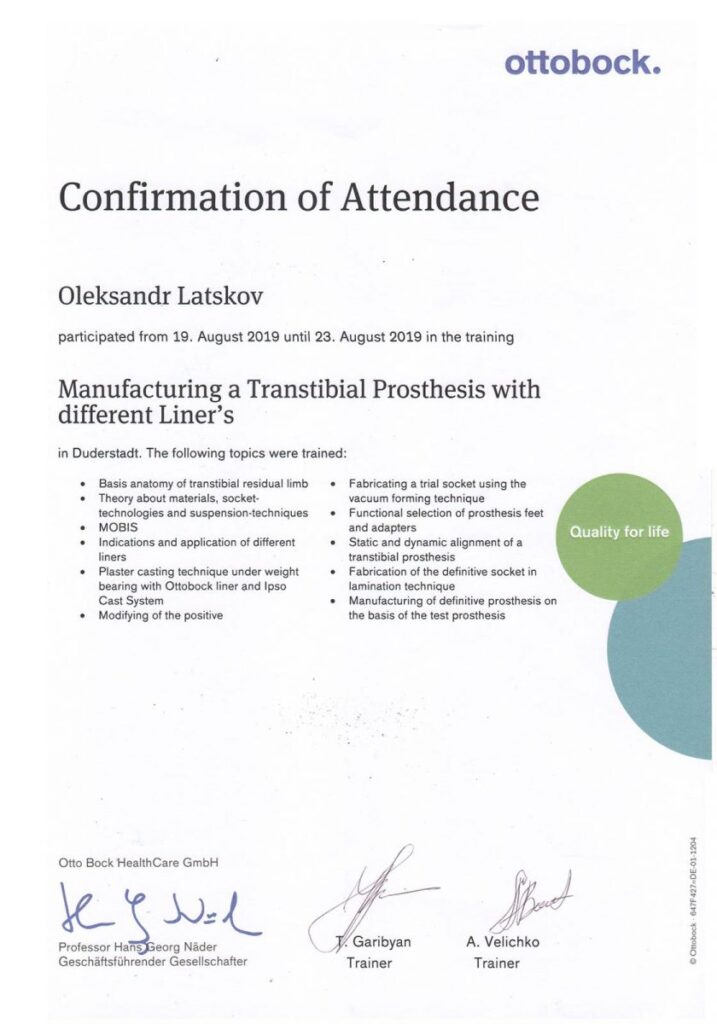 Авторська майстерня протезування працює відповідно до всіх вимог чинного законодавства України у сфері медичної та технічної реабілітації. Ми маємо всі необхідні сертифікати відповідності, ліцензії та дозволи, які підтверджують: